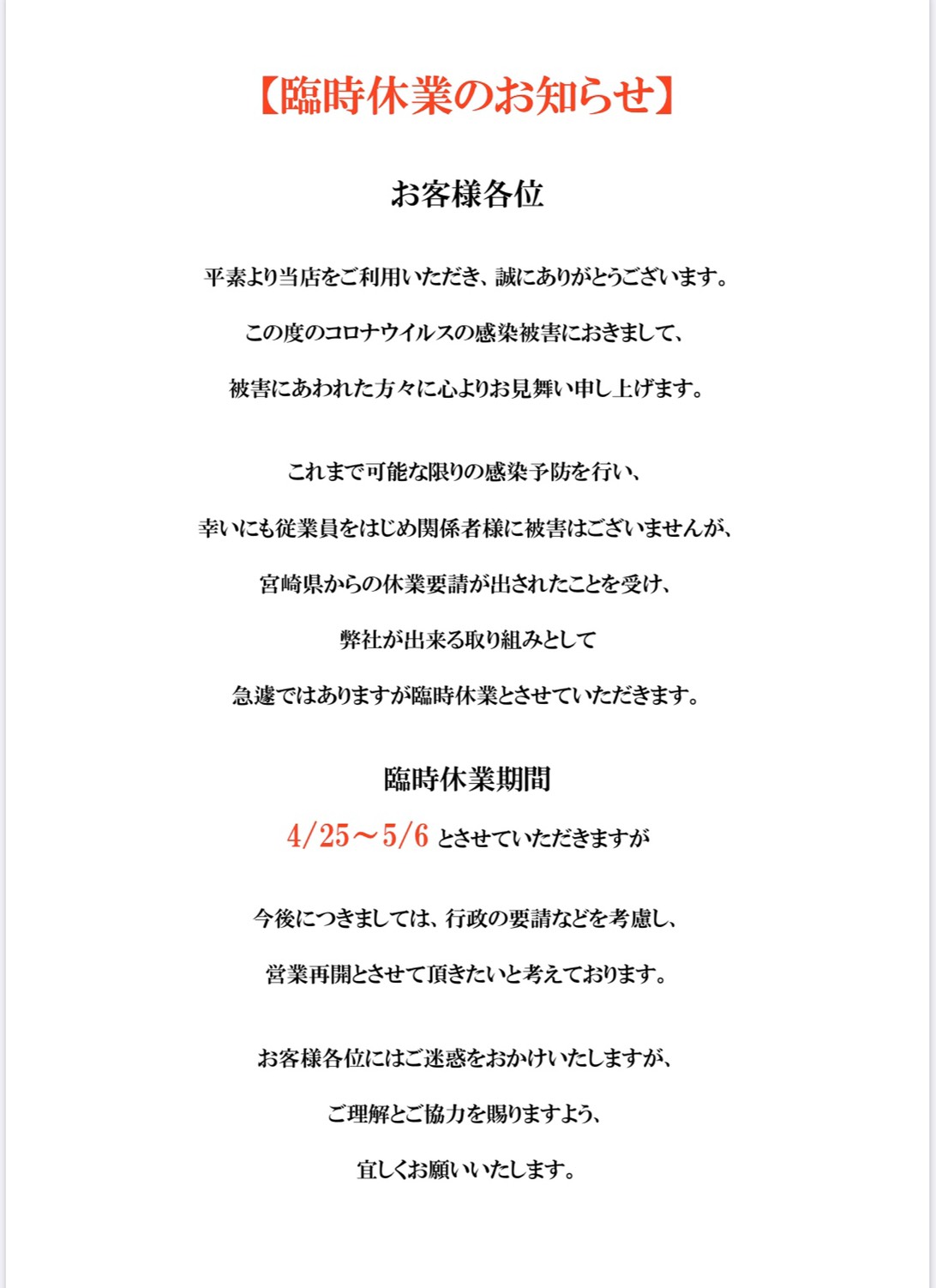 さて突然ではありますが、県からの休業要請を受け宮崎JUNGLEは4/25〜5/6まで休業とさせていただきます。